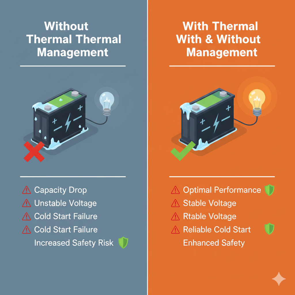 电池在寒冷环境中容量下降、输出功率不足、电压波动明显。 - 冷启动失败与系统可靠性下降: